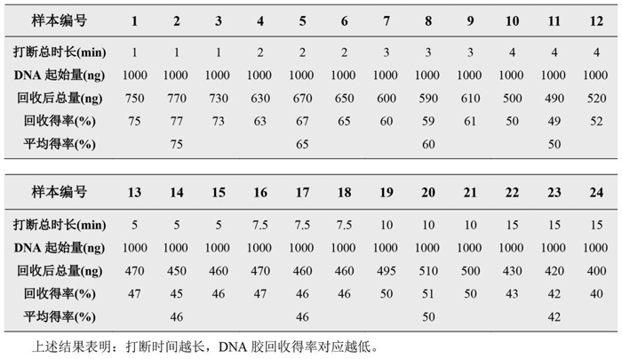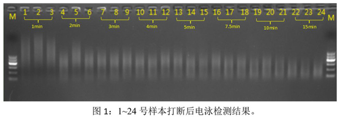 實(shí)驗結(jié)果表明:(1) 隨著打斷時間的增加,打斷片段的大小也隨之變??;(2) 相同打斷條件下,打斷效果的重復(fù)性和均一性良好。