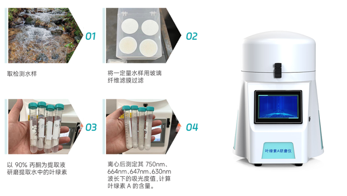 將一定量樣品用濾膜過濾截留藻類,研磨破碎藻類細(xì)胞,用丙酮溶液提取葉綠素,離心分離后分別于750nm、664nm、647nm和630nm波長處測定提取液吸光度,根據(jù)公式計(jì)算水中葉綠素a的濃度。