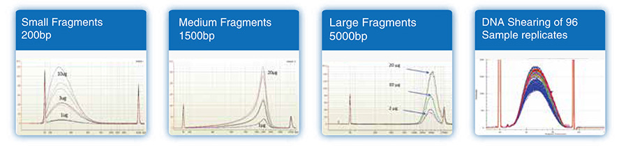 可對(duì)100bp-5kb范圍的DNA片段進(jìn)行高質(zhì)量的剪切,可得到高度重復(fù)的DNA剪切結(jié)果,并且DNA片段緊密分布在指定的大小范圍內(nèi),不同初始樣本量均能得到一致性的片段。